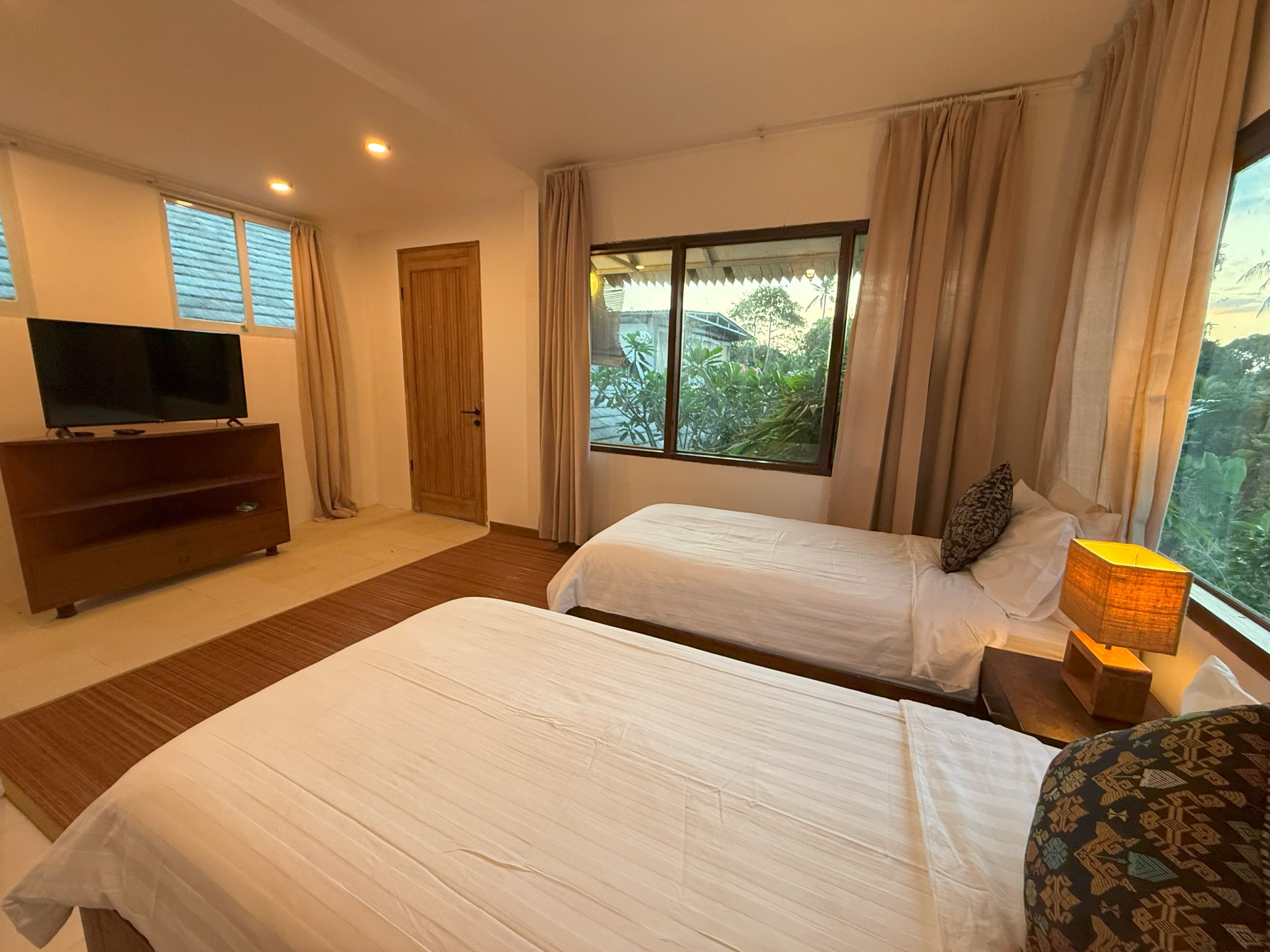 Ideal for friends of the group, or older children or a couple. This room is located across the grass that can be accessed via the outdoor stairs in the garden (detached from the main house). The versatility of this room is great as there are options of two single beds, or one queen size bed using practical and comfortable custom made Hollywood twin frames. Amaya Bali can cater for guest in villa, so that they can be part of the group but have their own space to retreat to when needed. With Internet TV, cupboards, windows, a lounge, AC, electronic safe & any open-aired bathroom.